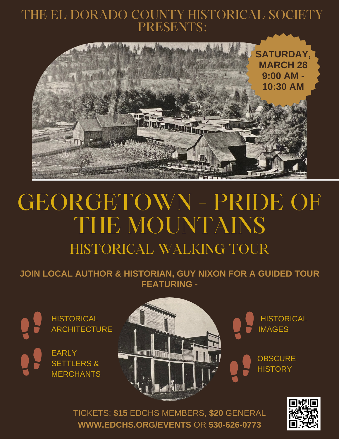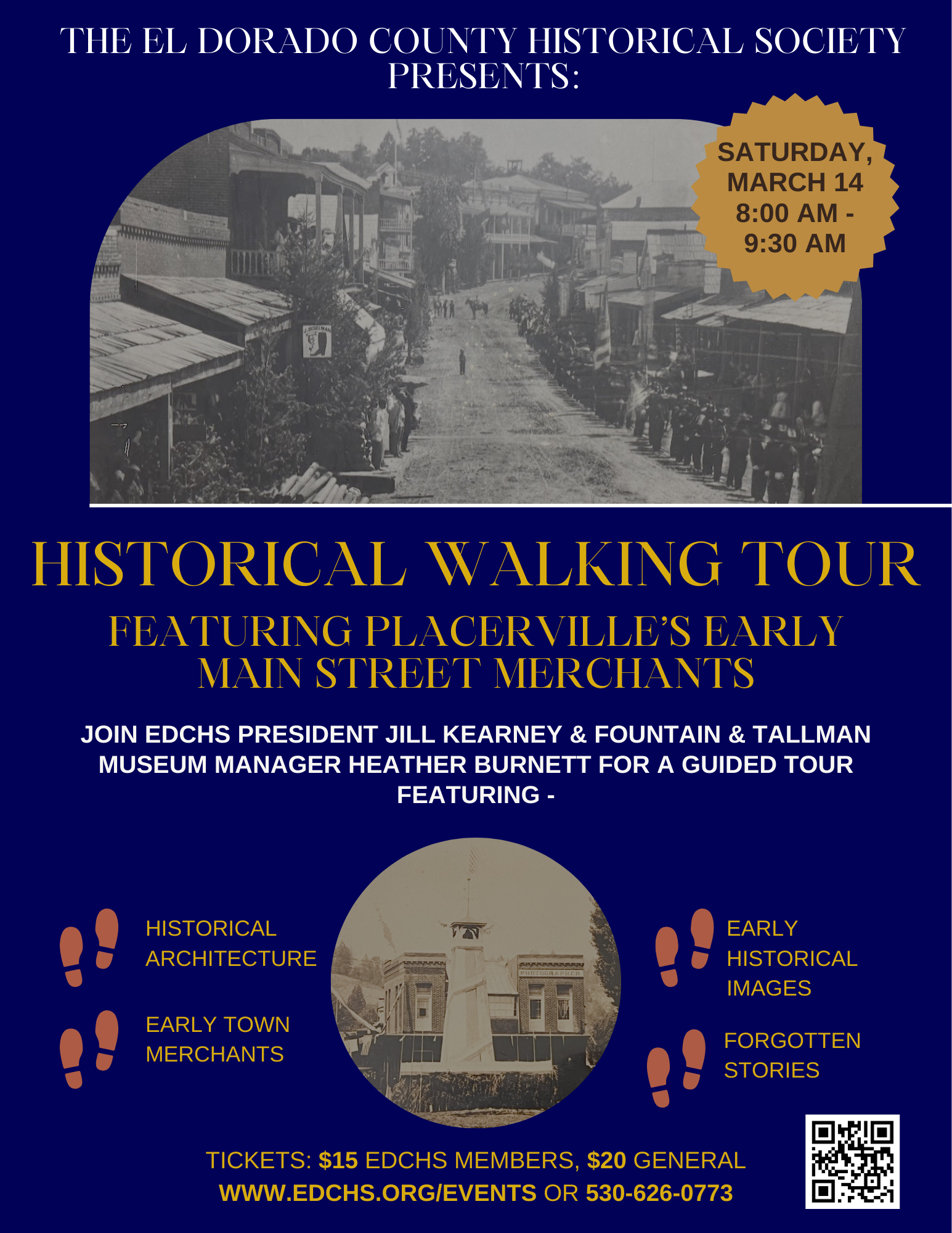 *All ticket sales are donations, the net proceeds of which support the EDCHS in its mission to honor the people who came before us by rescuing, preserving, researching, and displaying El Dorado County’s rich history, and to ensure that its significance will be appreciated for generations to come. Donations also help to support the operations and maintenance of the Society’s historic Fountain & Tallman Museum. If you would like to donate a different amount, please call us at our Fountain & Tallman Museum.