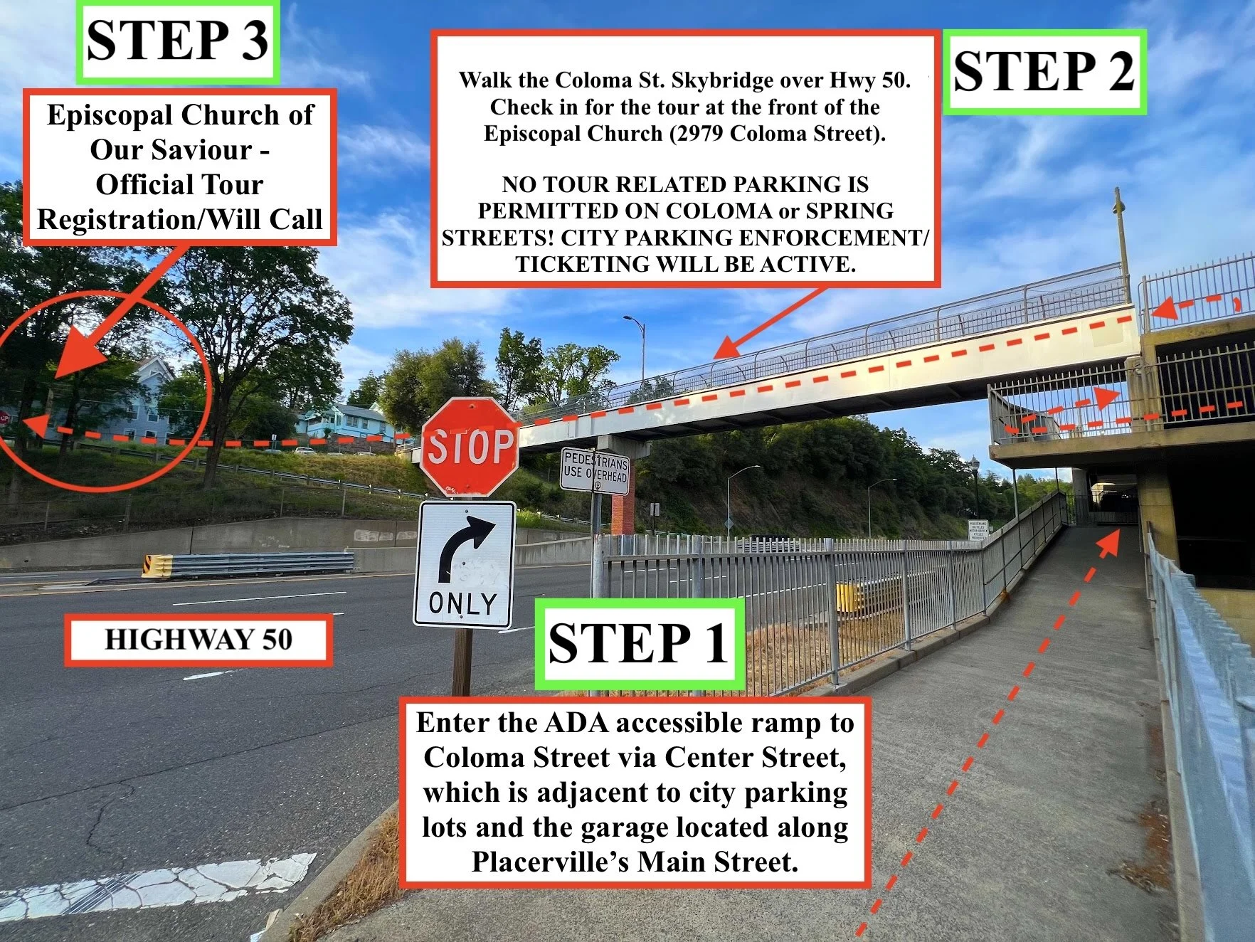 Important Parking Information: Please be aware that street parking is strictly prohibited along Coloma Street, Spring Street, and the surrounding neighborhood. All tour-goers must park in the city lots along Placerville’s Main Street. From there, simply walk across the Coloma Street skybridge over Highway 50 to access the tour—the Episcopal Church is located just on the other side!