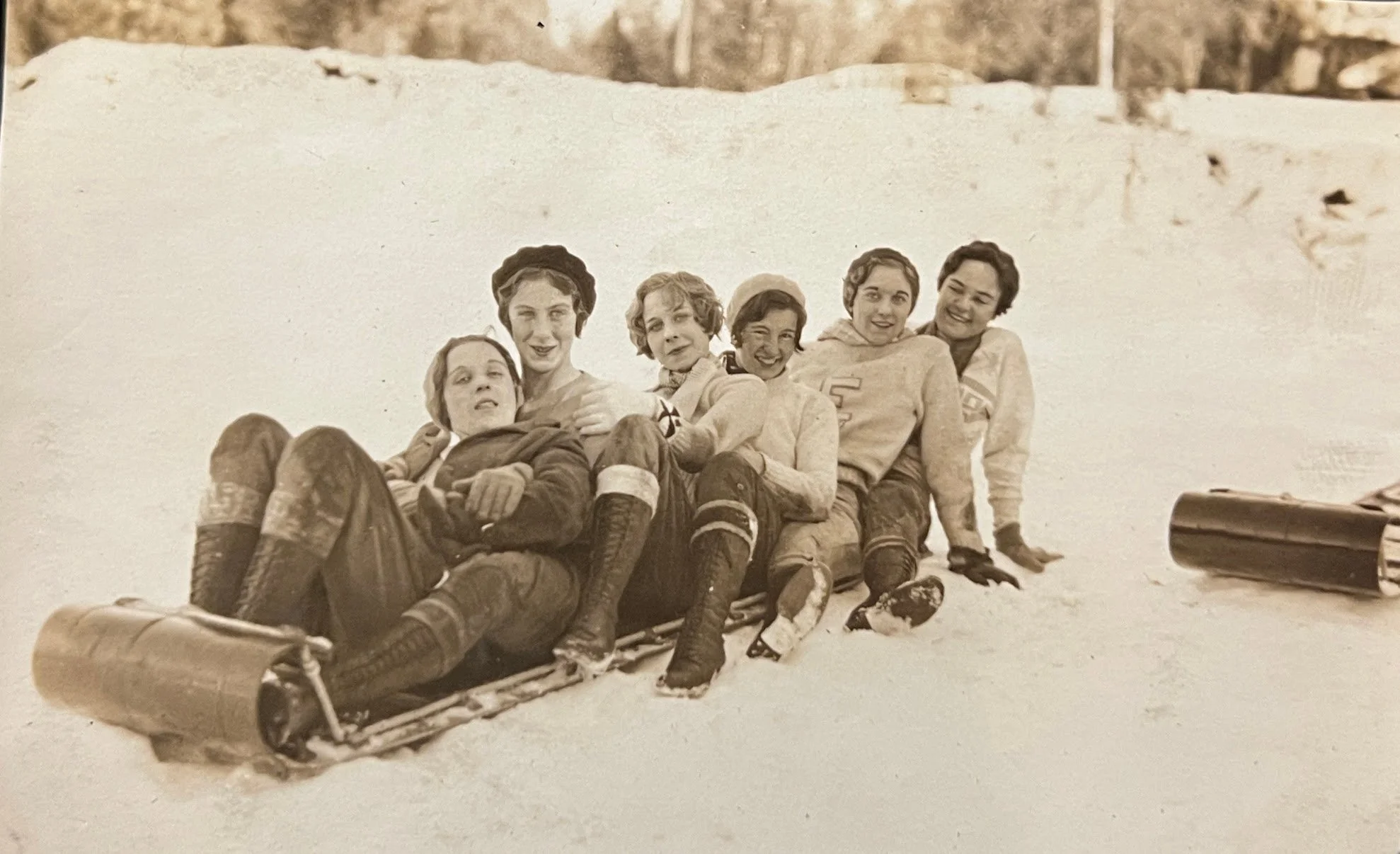 Image 7: El Dorado High School student Dorothy Morey poses with classmates on a toboggan at the Placerville Ski Club’s Fresh Pond site in 1933 (Heather Burnett Family Collection).