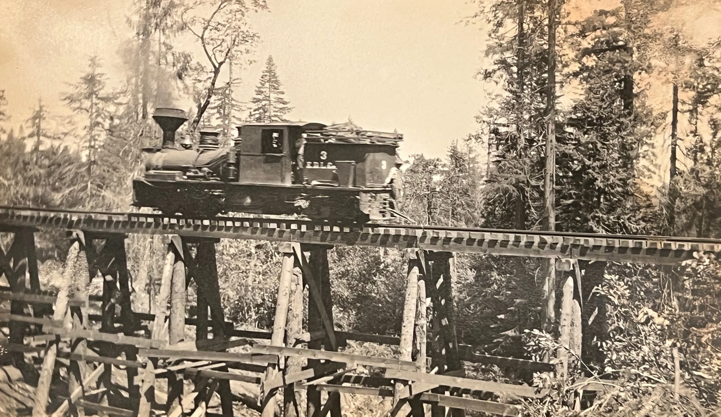 Image 1: A Michigan-California Lumber Company Shay locomotive crosses a high trestle in the 1930s, returning from a timber delivery to the mill site in Camino, California.